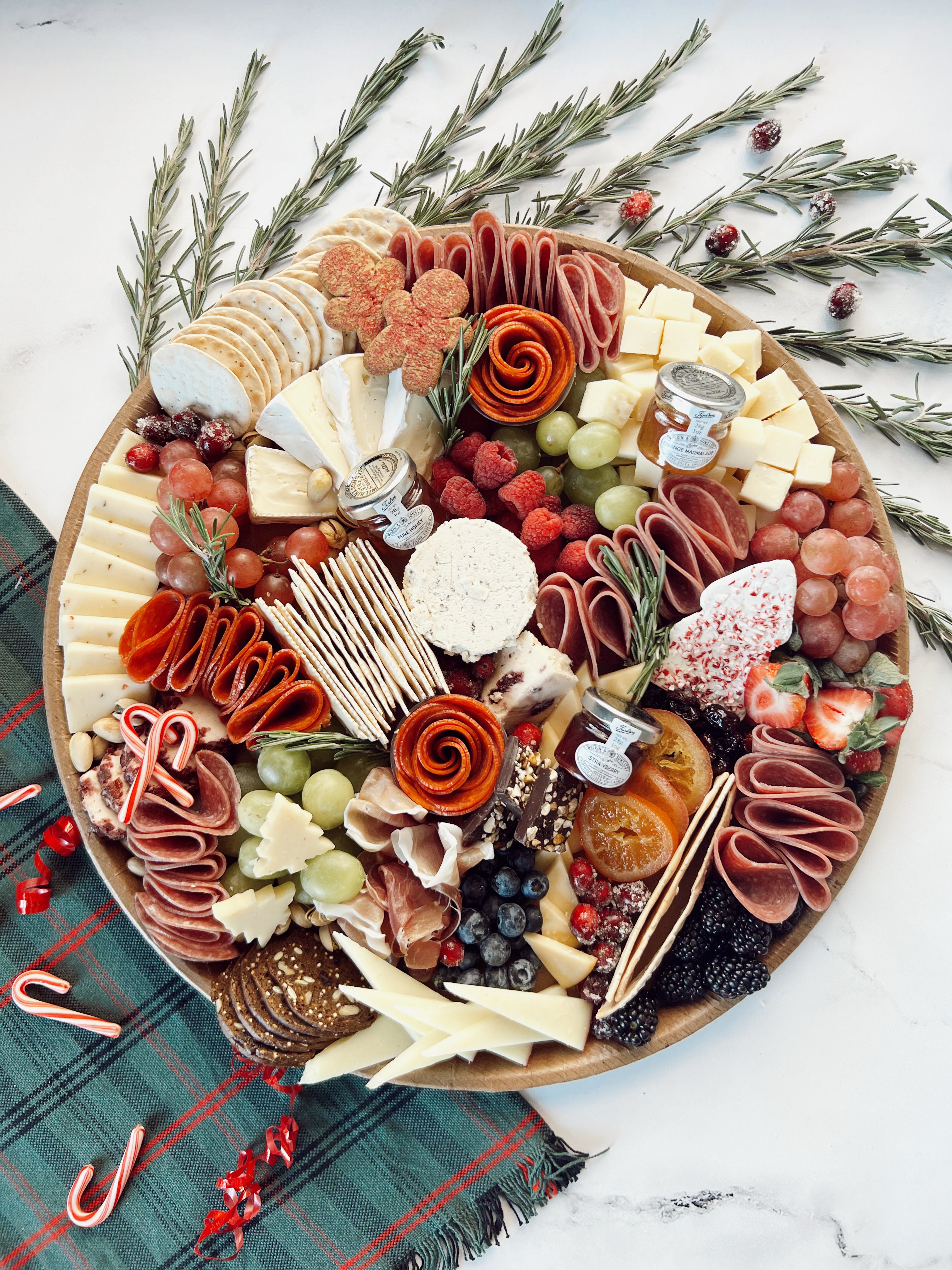 The holiday board also contains nostalgic Christmas favorites such as peppermint bark, gingerbread cookies, sugared cranberries + candy canes.
